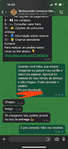 Read moreA COMIDA E BOA. PORÉM TEM UM PÉSSIMO ATENDIMENTO NA ENTREGA,DEMORA MUITO E NÃO DÃO NENHUMA SATISFAÇÃO PARA O CLIENTE E QUANDO A GENTE LIGA NÃO ATENDEM E QUANDO ATENDE SÓ SABEM FALAR Q ESTA CHEGANDO MAIS NUNCA CHEGA ISSO QUANDO NÃO TIRAM O TELEFONE DO GANCHO. HOJE POR EXEMPLO DEIXEI DE COMPRAR EM OUTRO LUGAR PRA PEDIR COM ELES E ACABEI FICANDO SEM ALMOÇO. LIGUEI ERA AS 8;40 DA MANHA PRA VIM NO PRIMEIRO HORÁRIO E AGORA SÃO EXATAMENTE 14;01 E NADA ACABEI FICANDO SEM ALMOÇO. ACHO ISSO UM ABSURDO E UMA FALTA DE RESPEITO COM O CLIENTE. POR ESSE MOTIVO ACABAM DE PERDER UMA CLIENTE. OBS: NÃO E A PRIMEIRA VEZ Q...