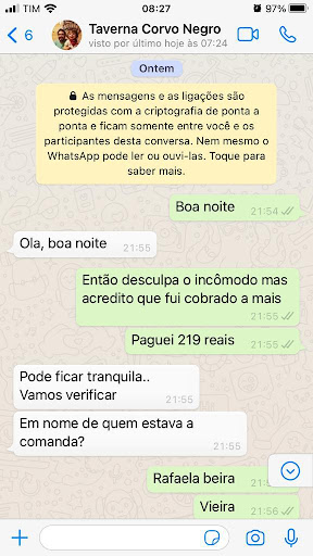 Ao fecharmos a conta e realizarmos o pagamento, percebemos que o valor estava muito alto, porém nos dirigimos ao carro e iniciamos a conta dos itens. Sem entender os valores solicitamos pelo WhatsApp da estabelecimento que nos fosse confirmado todos os itens cobrados.