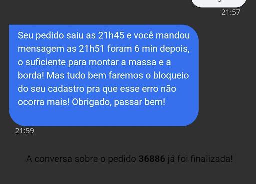 Perdem cliente por besteira. Fiz o pedido, escolhi sem querer a borda errada e solicitei alteração na sequência. Não quiseram trocar a resposta da pessoa que atendeu simplesmente foi : "estou te bloqueado no sistema para que o erro não ocorra mais" . Palhaçada. Eu reconheço que escolhi errado mas solicitei a troca e fui atendido dessa forma. Belo atendimento, na sequência o pedido foi cancelado e a conversa impossível de responder. Sempre pedi pizza na, e dessa vez fiz pelo aplicativo. Enfim, perderam cliente que sempre comprava por um...