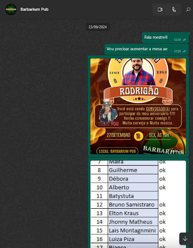 No dia seguinte, após a avaliação que realizei aqui no Google, o Dono da Barbarium Pub compadeceu com a situação e entrou em contato comigo pelo whatsapp imediatamente, na mesma conversa em que foi efetuada a reserva.