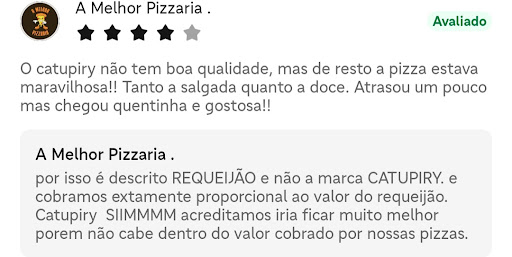 Read moreFiz um pedido pelo ifood. Avaliei com 4 estrelas pela qualidade do REQUEIJÃO (porque ficaram incomodados quando chamei de catupiry igual todo mundo faz, mesmo sem ser da marca), porém destacando que se tratava de sabor geral maravilhoso. Fui respondida com uma grosseria tremenda, nem devem ter lido o comentário inteiro onde teci outros elogios. Uma pena, porque foi devido a essa grosseria que nunca mais pedirei no lugar e já avisei a quem me pede indicações que...