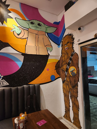 Read moreQuando falam em temática de Star Wars logo pensamos em um local tipo a cantina de Tatooine ou um bar de Coruscant. Não é o caso, mas Ok, sem problemas. O local é pequeno, por isso, se quiser lugar é bom chegar cedo ou ter paciência para esperar. É aconchegante também, pra quem consegue sentar nos sofás. Nos ofereceram uma mesa do lado de fora, o que normalmente eu recusaria, não só pela segurança, mas para curtir melhor o local também. Como a noite estava agradável, aceitamos. O problema foi aguentar o pessoal vindo oferecer artesanato. Nada contra, mas quando saio com a família é um momento que gostaria de não ser incomodado. O atendimento foi legal. Pessoal foi atencioso e solicito. Outro receio que tenho de ficar do lado de fora é a falta de atendimento. Mas sempre tinha alguém disponível ali. Pedimos chás batidos com limão que estavam ótimos. Os hamburgers também estavam muito bons, apesar de que pedi o ponto mais passado e veio bem vermelho. Gosto muito de carne mal passada, mas hamburger prefiro ao ponto. A porção de batata estava boa também, o cheddar era muito saboroso. No geral, a comida estava boa. Mas não justificam os preços. Dois hamburgers, uma porção de batata com cheddar e bacon, três chás e um chope por R$ 180 para dois adultos e uma criança, achei um pouco acima do que esperava pagar. Existem outras opções na região que tem qualidade igual ou superior, com preços...