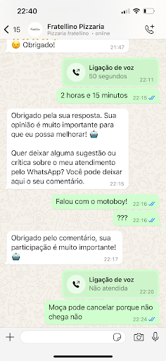 Read morePedi uma pizza 19:59 agora são 22:40 e a pizza não chegou, não é a primeira vez mas hoje passou de todos os limites, hoje é um dos dias que mais atrasou e o pior não chegou, falou que ia ligar pra o motoboy, que tinha saído de lá e nada, como está no print. Gente não peçam, falta de respeito total com o cliente enfim agora estou aqui fazendo janta depois de 2 horas e 40 minutos aguardando a pizza e uma pizza de 140,00 não foi...