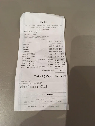 Estive no local com minha família — um total de cinco pessoas — sendo alocados na mesa 29, e optamos todos pelo serviço de RODÍZIO.