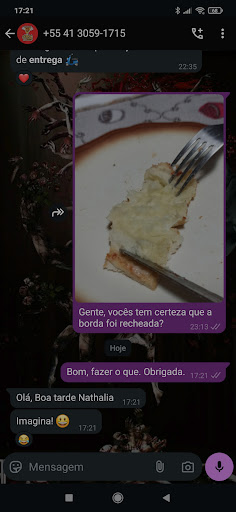 Aconteceu uma situação em que a pizza doce veio muito dura. Alguns até comeram, mas depois, quando a atendente veio retirar, expressamos nosso descontentamento, comentando que, infelizmente, a pizza estava bem dura. Ela nos ouviu, pediu desculpas e explicou que pode ter ficado algum tempo na bancada, o que justificaria a textura e saiu.