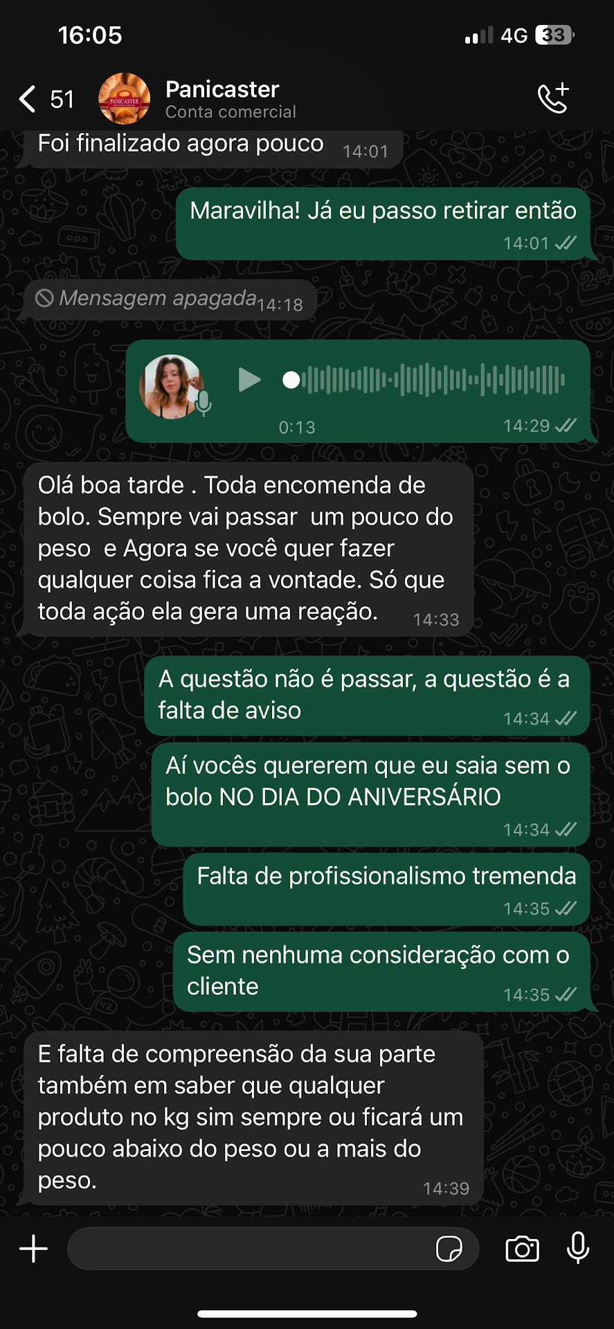 Read moreNao caiam nessa, não encomendem bolo deste lugar. Vou dar uma estrela só pelo sabor mesmo do bolo q encomendei, pois na aparência horrível, massa aparecendo com falhas ,visivel q faltou nata para cobrir. Encomendei bolo 3 kg nata com morango, passou quase 500 gramas, e o preço do kg bem salgado. Não ligo de pagar desde q seja um bolo bem feito, esperava mais por conta do preço . Era p aniversário da minha filha, única coisa q pediu foi GLITER e não tiveram a capacidade de por, ou me avisar q não tinha , q aconteceu imprevisto sei lá, só vi na hr da entrega, e nem dava mais tempo de encomendar em outro lugar. Confiei nessa confeitaria me decepcionei. E p piorar ainda a moça embalou de qualquer jeito, nem uma tampa decente colocou, oq resultou num bolo rachado cheio de trinca tbm devido pouca nata p cobrir. Tive q passar uma espátula em casa mesmo tentar consertar... os bolos de balcão tds lindos aí entrega uma encomenda porca dessa. Primeira e última vez. Não...