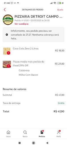 Ameaças por cancelar uma pizza queimada e ruim. Sexta feira eu pedi uma pizza pelo ifood uma pizza doce, pedi as 21:30 chegou 23:20 na minha casa extrapolando o horário no APP, além da pizza vir fria, veio toda queimada e dura, ainda por cima o recheio tinha virado um cima do outro, eu não iria reclamar por conta do recheio, mais assim que vi a pizza queimada e fria não teve jeito Não dava nem pra esquentar mais no forno pq iria terminar de queimar. Mandei msg no ifood reclamando a pizzaria alegou que o pedido estava conforme foi pedido. Primeiro vamos lá eu não pedi a opção fria, massa queimada e dura afinal de tudo eu não consegui consumir e joguei fora a caixa inteira de pizza Então o APP me fez o estorno do valor. Até aí ok Deu quase 01hr da madrugada o motoboy buzina na frente da minha casa, bate palma desesperado me cobrando a pizza pq eu cancelei e ele não recebeu a corrida. Que era sacanagem minha pedir e cancelar. Achei uma tremenda falta de educação além de vir fora do horário ainda veio aqui fazer ameaças, gravando o tempo todo sem autorização de imagens. Primeiro que nem comigo ele falou mas ele gritava e consegui ouvir tudo da janela, eu só nao sai para não acordar meu bebê, estou recém operada de uma cesaria, meu bebê tinha dormido fazia pouco tempo, eu até iria la falar com ele no portão, mais eu não sai estava frio e chuva e eu cheia de pontos na barriga. O cara todo nervoso no portão ameaçou voltar no outro dia que é hoje estou a espera dele pra ver oque ele acha que vou fazer. Poderia ter vindo aqui na parte da manhã ou a tarde, explicasse a situação numa boa, eu poderia até pagar a corrida dele ja que o estabelecimento não tem condições, pois entendo que ele estava só fazendo o trabalho dele. Mas pela falta de educação e empatia se ele perdeu a corrida eu peço desculpas mas nunca foi a minha intenção, em nenhum momento eu agi de má fé, fiz oque estava no meu direito como consumidor. Se ele achar ruim que reclame com a empresa...