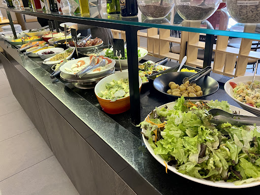 Modest buffet restaurant with a selection of vegetables, hot dishes & grilled food, plus a bar.
