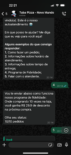 Fiz 6 pedidos anteriores pelo site (sempre para retirada) e todos eles foram confirmados no WhatsApp com a mensagem: “Seu pedido foi confirmado. Número X de 10”. Ou seja, estava acompanhando normalmente meu progresso no programa, aguardando o benefício prometido de R$ 30 no 11º pedido.