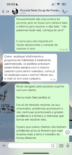 No entanto, ao fazer o pedido mais recente, fui surpreendido com a atendente dizendo que aquele era o meu primeiro pedido. Estranhei e fui até a pizzaria pessoalmente resolver. Chegando lá, fui tratado com total indiferença. A atendente sequer tentou entender ou solucionar a situação. Disse apenas: “Não temos o que fazer, o senhor vai ter que começar do zero”.