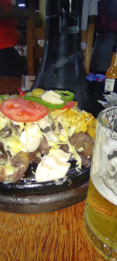 Um restaurante que oferece um vasta carta de opções entre almoço com churrasco, porções e bebidas além de sanduíches e outros.
