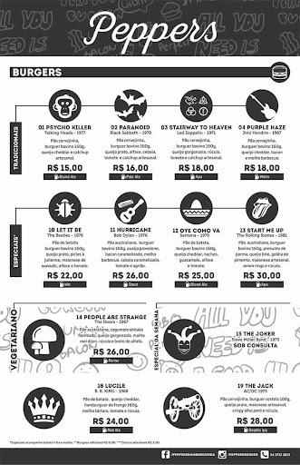 Read moreÓtimo lugar para quem pensa em comer bem e passar o tempo. O ambiente é muito agradável, bem decorado, com música e televisão, tudo no maior estilo Rock n' Roll. O cardápio é temático, cada burger leva o nome de um sucesso do rock, o que é muito legal. O cardápio também oferece diversas opções de burgers e porções, bem organizado, com tudo descrito. Ao fazer o pedido, sempre perguntam qual o ponto da carne que você quer - e sempre vem certinho (e sem muita demora!). Esse é o lugar onde a comida é até melhor do que na foto. Também sempre há disponível uma variedade de bebidas, drinks e chopps. O atendimento também é excelente. O pessoal que trabalha no Peppers é sempre muito simpático, solícito, atencioso e bem-humorado. Não é um lugar muito barato, mas é uma experiência gastronômica que...