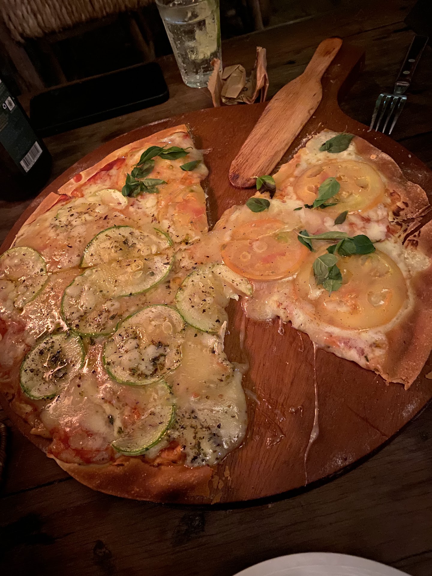 This is a very cute place, with live Brazilian music and a selection of different dishes. They also have a pizza oven and after a few days of sea food eating, it was nice to get a pizza which was tasty. Good crust and you could half the toppings. However you have to understand that this is Brazil and pizza is definitely not our speciality. The crust is think and crispy. Probably very different from the idea of pizza of a lot of people. Just bare...
