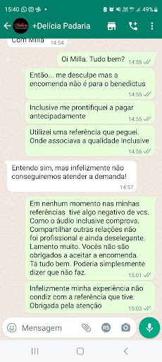 Eu comprei na mais delícia de 2014 até 2020 que foi qdo me mudei de Porto para Belo Horizonte. Em 2020 a empresa na qual eu comprava ficou apenas com a outra parte uma vez que eu não me encontrava mais na cidade e já não era a responsável por compras. Nenhuma compra a partir desse ano foi feita por mim Franciene. Mas a Mais delícia insiste até hj em vincular o nome da minha atual empresa com débitos da empresa passada que não estavam em minha responsabilidade. Nenhuma nota assinada por mim! Inclusive todas as vezes que indico os produtos da padaria para um morador ele me retorna dizendo que a padaria se recusa a fazer pq a empresa pq a empresa possui débitos! Eu já falei umas :x na padaria que eu não estava aí e não fiz compra alguma , para eles procurarem a sócia que ficou responsável e cobra-la. E pararem de vincular o nome da minha empresa daqui lá! Venho aqui a dizer: minha empresa atual em bhte leva o mesmo nome , porém não fiz nenhuma dívida com vcs! Comprei de 2014 até o último dia que vim embora da cidade sem deixar 1 real pendente. Todas as notas existentes aí não possuem minha assinatura! Eu levarei isso a vias judiciais se preciso for! Isso mancha a minha imagem na cidade aonde já tive o mesmo empreendimento e mancha...