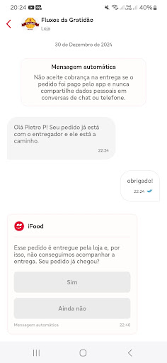 Avaliei o restaurante ontem por cancelarem meu pedido depois de um longo tempo de espera pra entrega, me responderam aqui dizendo que tentaram contato e alegaram que enviaram 12 mensagens e ligaram para concluir a entrega pelo Ifood. Apenas admitam o erro foi de vocês e cancelaram sem nenhuma justificativa! Foi uma péssima experiência e a verdade é que não houve contato algum, pra que mentir?! Segue os prints da...