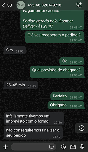Read moreFiz um pedido às 20h20, com previsão de entrega até 21h30. Já passam das 22h20 e a pizza não chegou. Tentei contato com a loja, mas não obtive nenhuma resposta. Uma pena, pois sempre gostei da pizza, mas diante desse descaso com o cliente fica inviável...