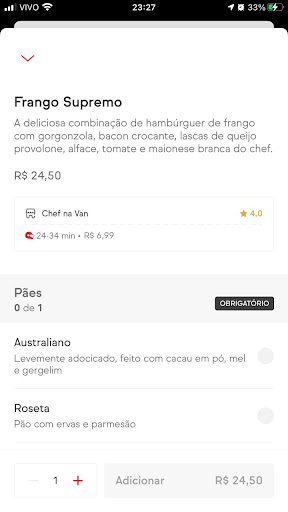 Read morePelo iFood, comprei o Hambúrguer “Frango Supremo”, descrito da seguinte forma no aplicativo: “A deliciosa combinação de hambúrguer de frango com gorgonzola, bacon crocante, lascas de queijo provolone, alface, tomate e maionese branca do chef”.