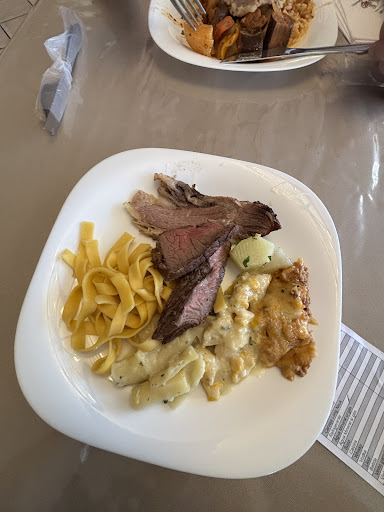 Avaliação de um almoço de domingo, dia 9 de julho de 2023. O buffet é caprichado, oferece muitas opções de pratos quentes, frios e saladas. Além disso, há um mini buffet com feijoada (simples), sopa e abacaxi com canela assado (que quando a gente pega já está frio). Mas o chamariz é a "churrascaria", certo? Bom, aí, neste quesito, o local deixa bastante a desejar. São poucas opções de carnes que o cliente tem que buscar na churrasqueira. Aí é aquela fila e a chatice de levantar 2, 3, 4 vezes da mesa para reabastecer o prato. A qualidade das carnes é razoável. Não são cortes bons e não dá para exigir o ponto. Poucas opções de sobremesa, mas estavam saborosas. Valeu a pena? Se levarmos em conta o custo-benefício, sim. Comida de qualidade sem facada no rim. Gastamos 64 reais por pessoa (sem bebida). Ainda sai mais em conta que almoçar em praça de alimentação de shopping center. Mas não é, nem de longe, uma...