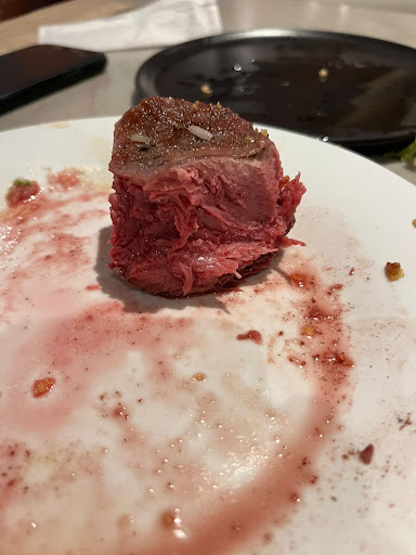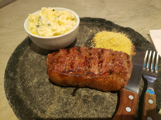 Sobre a comida em si, pelas experiências que temos com outros bons restaurantes de carne, pelo preço (R$ 110,00 um bife ancho de 100g, R$ 130,00 com batata frita) esperávamos pelo menos uma apresentação melhor. A carne é boa mas simples, não condiz com o valor cobrado. O ponto estava um pouco a mais do que pedido (foi pedido ao ponto para mal passada). A guarnição de batata frita é um exagero e também da mais simples qualidade. Assim como a farofa, super simples. Nossa impressão foi de que estávamos comendo um PF super faturado.