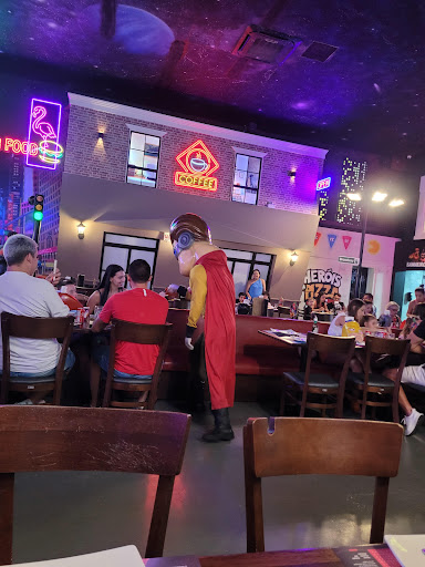Read moreA idéia é bem bacana, especialmente para a criançada, mas o atendimento logo na chegada é absurdamente desrespeitoso. Fui a um aniversário de criança, mesa reservada e ao chegar não conseguia entrar, pq a pessoa que recepciona estava totalmente perdida com as demais pessoas que chegavam ao lugar, obrigando todos a procedimentos burocráticos sem nexo, e se comunicando com outra pessoa que estava dentro do salão, fechado com uma porta de vidro, dando a impressão que a casa estava lotada, quando na realidade estava vazia !! O mais absurdo contudo, aconteceu enquanto estava a caminho. Nosso anfitrião nos ligou perguntando se iríamos demorar, pois para ter acesso a mesa reservada com 48 hs de antecedência, teríamos de entrar todos os convidados juntos !!! Jamais vi tamanho desrespeito de um restaurante com seus clientes, especialmente com alguém que irá lhe trazer seus convidados para pagar caro, bem caro (R$ 99,00 + 10% = R$ 99,90) por um rodízio de pizzas mediano, diga-se de passagem. Apesar do esforço para serem "bacanas" com a criançada, usando uniformes de super heróis, o atendimento foi muito disperso e imcompleto, por exemplo, não conseguiam servir um mesmo sabor de pizza para todos na mesma mesa. O ambiente é bem decorado, mas excessivamente barulhento, com música eletrônica alta, além de alguns garços gritando ao chegar na mesa para servir, ok como parte de sua performance, mas duas horas ouvindo tal performance cansa até a criança mais animada. Enfim, valeu conhecer a proposta, mas o custo benefício é realmente fora da realidade e não se justifica, pela qualidade do atendimento e comida...
