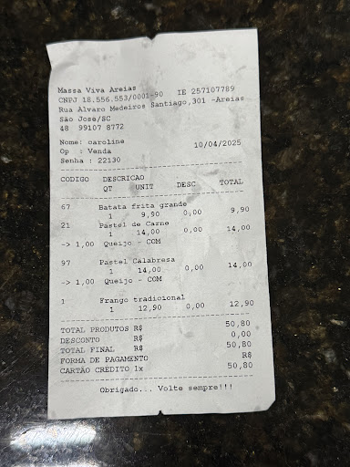 Read moreO estabelecimento possui DUAS placas informando o valor do pastel de carne com queijo, bem como o de calabresa com queijo, por R$12,00, mas qdo vc pede, é cobrado o adicional do queijo porque “o patrão manda”. As funcionárias tentaram explicar, dizendo que em uma das placas tem “adicional 3,00”, o que não tem na outra e nem bate com o valor praticado, mas acabaram tendo que realizar uma prática ilegal por orientação do dono e empregador. Para nossa surpresa, o calzone estava gelado, pois uma das funcionárias soltava às 20h e antecipou a entrega! Balcão estava com poucos calzones prontos, o que obriga o cliente a esperar e correr o risco de comer gelado. Reclamamos e foi feito um novo calzone, mas, como consta na nota fiscal, o valor dos pastéis não foram ajustados. Uma das placas tbm foi retirada… pior...