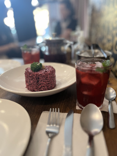 O destaque do cardápio são os diferentes Pelmenis e Pierogis (sempre recomendável pedir junto o creme azedo para acompanhar, pois a cremosidade é sem igual) - a variedade de recheios garante a vontade de retornar muitas vezes para experimentar todas as combinações e adicionais. Os Blinis (panquecas) são fartos e estão entre os meus preferidos, com particular destaque para o blini de cogumelos com queijo. Já os pratos mais tradicionais (como as kotletas) são imbatíveis para sentir a harmonização das proteínas e seus acompanhamentos. As saladas, que geralmente servem de entrada, são extremamente bem construídas: a favorita é a shuba de salmão, especialmente em dias quentes. Por fim, também as sobremesas são imperdíveis: a “praça vermelha” é o ponto alto da experiência (impossível descrever: é equilibrada, harmônica, bonita, bem servida para 2 pessoas), mas todas as demais sobremesas são encantadoras (recomendo o Sonho da Romênia e também a tortinha de amendoim com caramelo salgado). Os chás gelados feitos na hora são pedido obrigatório. Enfim: no quesito Comida, é 5/5, 10/10 ou 100/100, sempre.