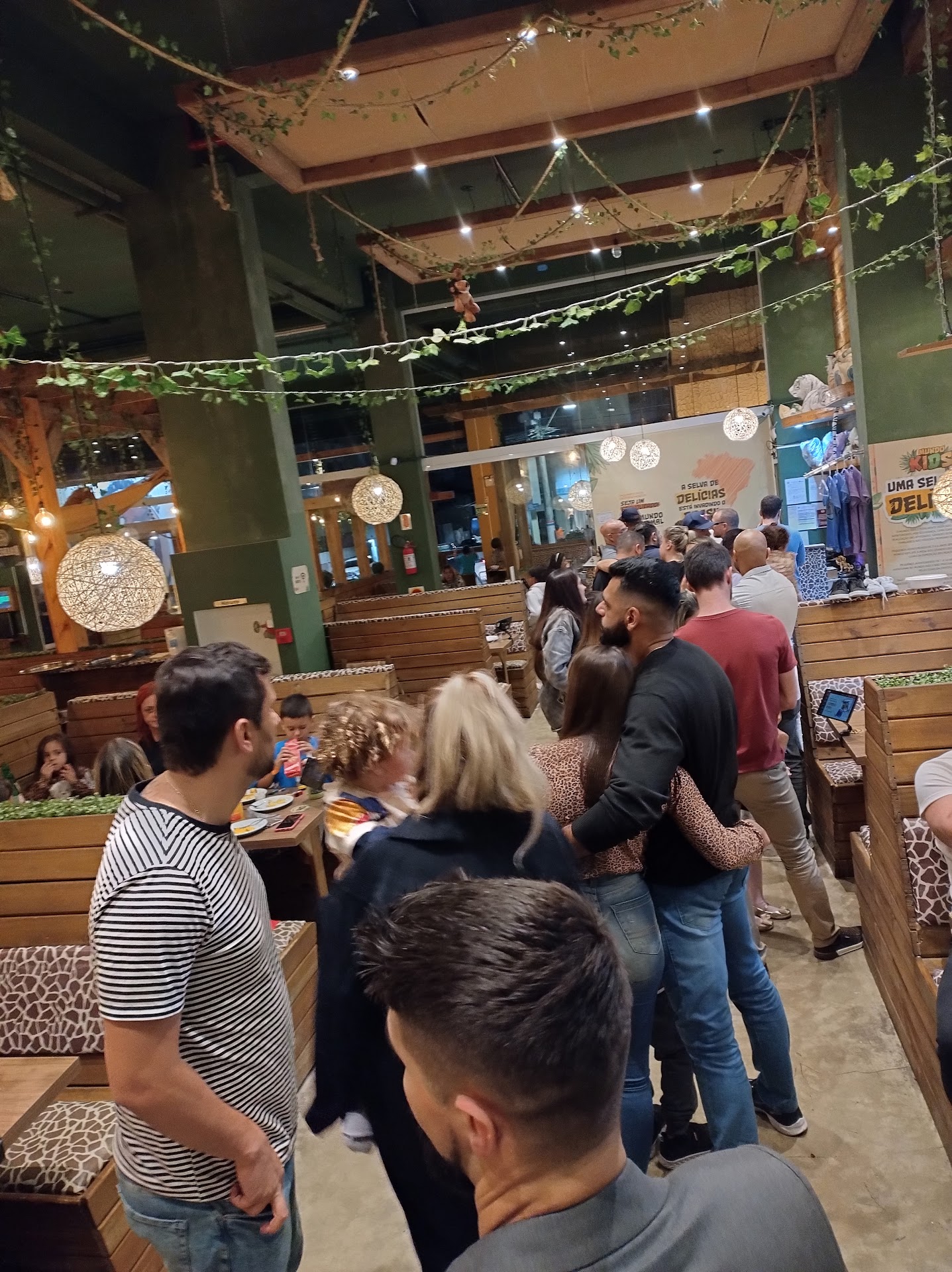 AMBIENTE: O ambiente deixou muito a desejar. A iluminação é insuficiente, o sistema de som é de baixa qualidade, e o volume está excessivamente alto. O banheiro masculino apresentava o piso muito molhado, o que é preocupante, especialmente considerando que as crianças, ao usar o Espaço Kids, precisam tirar os sapatos, molhando sapatilhas ou chinelos nessa água. Além disso, o Espaço Kids é extremamente pequeno para um local com temática infantil. A cada poucos minutos, a funcionária pede que algumas crianças saiam para dar lugar a outras, o que torna a experiência ainda mais frustrante.