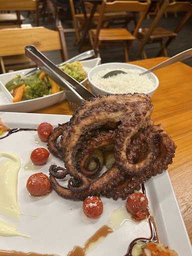 The location is nice, tables inside and out. Parking is easy and the staff is ample, friendly and efficient. They also seem to speak a little English, although I do speak Portuguese. Unfortunately, like a lot of places in the Praia Mole area the food wasn’t very good. We ordered the chef’s special povo. It was cooked uneven, very dry tentacles, but the body was OK, a bit chewy. Just no flavor to speak of, and it was very, very salty. It’s an order for two, we didn’t finish half. Served with a generic bowl of white rice, no beans, and some soggy boiled veggies. Potatoes were pretty good, and you get a lot of them....