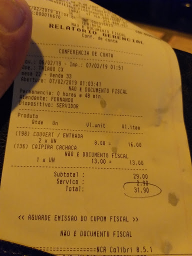 Read morePéssima experiência! Após entrar com minha esposa, precisei sair, por motivos próprios em 10 minutos, tendo tomado somente uma cerveja, recebi a conta cobrando 2 “entradas”. Perguntei do que se tratava e se eu poderia não pagar por ficar pouco tempo e não saber da cobrança. Me foi mostrada uma pequena placa no canto na entrada com o dizer da cobrança e que não poderia ser aliviada. Tremenda falta de bom senso e respeito com o cliente. Decidi pagar e tirar os 10% e PASMEM! Me disseram que se eu quisesse tirar os 10%, eu deveria ir ao caixa pagar, que não receberiam minha...