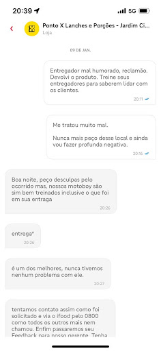 Primeiro, o motoqueiro tratou minha mãe super mal, gritou com ela, totalmente mal educado e agressivo, sendo que foi avisado para a loja que estava sem interfone, se ao ligar pelo iFood, não completou a chamada, então deveria ter comunicação entre loja e entregador, obviamente visando entrar em contato com os clientes através do chat do aplicativo.