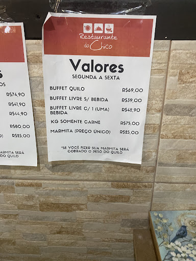 Estivemos no Restaurante Chico na data de hoje para almoço , com a equipe de natação de Lages, éramos um grupo grande, com cerca de 45 pessoas. Assim que chegamos, perguntamos sobre os valores, e nos informaram que o preço seria R$ 42,90 por pessoa, com desconto do valor inicial de R$ 45,90. No entanto, ao nos servirmos, percebemos que havia balança para calcular o preço por quilo, e muitos pratos indicavam valores significativamente menores, como R$ 20 ou R$ 30.