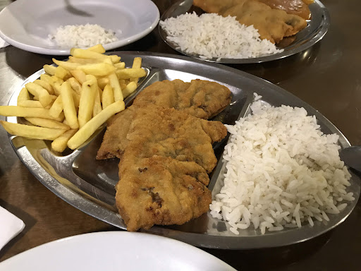 B) Executivo de peixe à milanesa. Peixe, filé de pescada, sem espinhos, estava bom O arroz, o mesmo, opaco, seco frio. Pirão, sem gosto de nada.