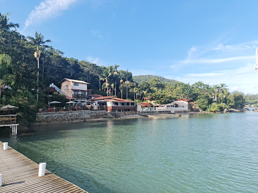 Existem vários ambientes, em vários níveis, e eu fiquei no nível mais baixo, de frente para o tranquilo mar de Sambaqui, com o trapiche e pequenas embarcações colaborando com o incrível visual.