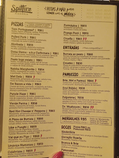 Entre as pizzas, destacam-se a Dona Gema, a Red Hot Cheese n' Peppers e a de Linguiça Blumenau. A Dona Gema, em especial, é imperdível. Já frequentamos a Spitfire há bastante tempo, sendo uma de nossas pizzarias favoritas em Florianópolis. Na última visita, pedimos a entrada Morro Azul, que foi perfeita para acompanhar duas pizzas. Para nossa surpresa, mesmo satisfeitos, ainda trouxemos metade de uma pizza para casa, o que demonstra a generosidade das porções.