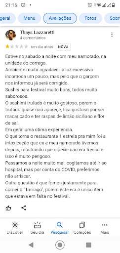 Read moreINTOXICAÇÃO ALIMENTAR GRAVE E DESCASO DOS PROPRIETÁRIOS! Essa foi a minha experiencia no sushi +arte no Corrego Grande. No dia 14/05/21 eu mais quatro pessoas estivemos no local e pedimos festival. TODOS NÓS TIVEMOS INTOXICAÇÃO ALIMENTAR! lá no local eu já comecei a passar mal e tive que ir embora. na madrugada achei que teria que ir para o hospital. Minha irmã no mesmo dia entrou em contato com eles pelo whatsapp. (isso era meia noite). No dia seguinte mandei mensagem e contei a situação, pedindo que eles averiguassem. NÃO HOUVE PREOCUPAÇÃO NENHUMA POR PARTE DO RESTAURANTE! Inclusive deram a entender que isso não poderia ter acontecido, que os peixes são frescos, duvidando mesmo de mim. Aí eu me pergunto: 4 pessoas passaram muito mal e o restaurante ainda duvida!?? Eu continuei pedindo um retorno para saber se mais pessoas haviam entrado em contato e relatado a intoxicação e eles negaram. Eles simplesmente não deram importancia. Mas algo muito interessante aconteceu: eles receberam uma avaliação negativa aqui no google também de INTOXICAÇÃO ALIMENTAR, e acharam que tinha sido um de nós quatro, mas para a minha surpresa e a deles, não tinha sido nós e sim outro casal que também passou muito mal. HOje vi que o comentario não está mais aqui, mas eu tenho o print e vou postar aqui . Então o proprietario, achando que eu tinha feito a avaliação negativa, só assim veio me pedir para apagar e que ele nos convidava para ir no restaurante comer outro dia, mas as quatro pessoas optaram pelo ressarcimento, pois compramos um serviço e nos foi entregue algo podre. Por fim hoje já é dia 03/06 e até agora não fui ressarcida. Cada hora é uma desculpa e eu que tenho que ficar correndo atrás deles. Por fim, CANSEI!! Uma intoxicação não deve acontecer, mas eu sei que infelizmente as vezes acontece, mas o descaso com o cliente, isso é inaceitável!!!!Espero que as pessoas escolham outro lugar para comer, pois um lugar que não respeita o cliente, não deve ser...