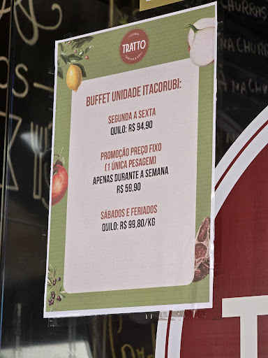 É uma loucura esse restaurante cobrar R$99,80 aos sábados pela simplicidade do que oferece. Poderiam ao menos repor adequadamente os pratos. Se o local se propõe a funcionar até 15h, não é admissível que, às 13:50, várias coisas estejam faltando. O prato da picanha estava vazio, e as outras proteínas (bem mais baratas) estavam amontoadas (como se tivessem juntado todas as sobras em um prato só) e com aparência de secura. Também não tinha mais um tal de arroz cremoso, que era o único prato que parecia mais diferente e elaborado. Ou seja, não vi nada de cozinha criativa, que é uma das propostas do local. Também achei bem fraca a diversidade de saladas. Por quase cem reais o quilo, o mínimo que se espera são pratos mais elaborados, insumos mais caros, reposição eficaz e ampla variedade. O que é oferecido ali facilmente se encontra pela metade do preço em buffets do bairro Santa Mônica ou região da UFSC. Mas posso citar restaurantes da mesma faixa de preço que são infinitamente superiores e com pratos diferenciados: La Bohème, Trofi, Falah, Quatro Estações e Restaurante da Família. Infelizmente, o TRATTO é o único buffet da região, e, talvez por este motivo, lamentavelmente cobra um preço abusivo. Eu não faria uma reclamação deste porte se o preço fosse justo. Como é caro, o nível de exigência do cliente sobe. Melhorem (ou...