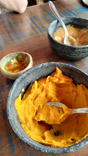 Read moreConheci o restaurante numa noite chuvosa e fria, portanto, não havia muito movimento. Fomos muito bem atendidos pela Mari, super simpática e atenciosa. Explicou-nos o cardápio e tivemos boas conversas entre os pratos. Pegamos o shimeji crocante de entrada, e gostamos bastante. Comemos cogumelos frescos com bastante frequência e o modo de preparo deste foi diferente de tudo o que já vimos. De principal, pedi um peixe branco com molho ácido. Me arrependi de ter pegado o creme de cenoura defumada de acompanhamento: além da quantidade exagerada (poderia vir menos da metade do que veio), o processo de defumação roubou todo o sabor do restante. Minha esposa pegou uma feijoada de frutos do mar (vem peixe, camarão, polvo no feijão cozido no caldo de peixe). Estava bem bom e bem servido! A sobremesa de mousse de chocolate com castanhas e geleia de butiá estava no ponto! Não era doce e os ingredientes e texturas eram harmoniosos. Vale mencionar os drinks não alcoólicos que estavam ótimos, esqueci o nome do barman mas ele veio se apresentar, parabenizamos muito seu trabalho! Voltaremos para experimentar os drinks autorais em outro momento. Ambiente bem gostoso e com ótima playlist. Parabéns e...