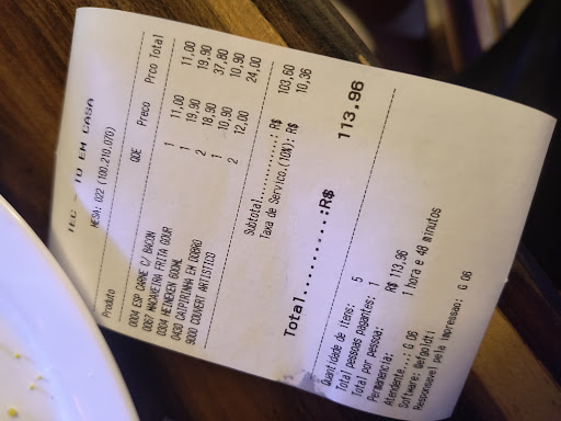 Read morePassando pra deixar meu relato pleno sábado 21/09 tiramos o dia pra visitar o tô em casa , chegamos cedinho 7:40. Pedimos um drink de maracujá e uma Heineken chegou rápido coisa de 10 min e solicitamos petisco. Deu 8:26 pedimos pra olhar se já tava saindo e nada. 8:45 pedimos a outro garçom pra ir olhar ele disse q n sabia oq tinha acontecido e nós mortos de fome. Perguntamos se tinha como sair algo mais rápido um espeto ou uma batata. Solicitamos uma batata 8:55 nada chegou até q pedimos a mesma pessoa q atendeu a gente uma mulher onde estava nosso pedido e ela disse por um estante não tem e eu disse oq ? Ela disse vem já vem já. 9:02 cancelamos tudo e viemos embora. Perdemos nosso sábado ! Total da conta 67,00 somente nesses dois itens pq só de couver deu 24,00 NUNCA MAIS !...