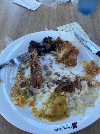 Procurei uma outra opção para refeição depois de descobrir in loco que o Tio Armênio serve a chamada comida "requentada", escolhi o Divino Fogão. Adianto, foi o pior almoço que fiz neste ano. A variedade de opções me atraiu, no entanto procurei muito o preço do self service e não achei, não iria pagar por algo que não sei o preço (quem faz isso é herdeiro ou hipócrita que quer pagar de "rico"). A atendente me mostrou onde tinha o preço, e era muito escondido (como mostro na imagem. Tinha embalagem sem álcool em gel e luvas decorativas que ninguém usava. Mas, o pior era a qualidade mesmo. Primeiro, deram-me um talher sujo, como mostro na foto, depois quase me engasgo com um osso no Rondeli de frango. Usaram as piores partes do frango para fazer esse rondeli, mas usar o peito é básico. E, por fim, meu estômago não recebeu bem a comida. Experiência horrível, melhor comer...