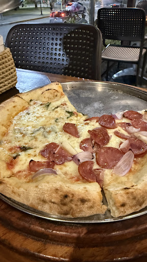 Pedimos duas pizzas: calabresa e margherita. A pizza de calabresa estava saborosa, com massa estilo napoletano, de borda mais alta, provavelmente assada em forno a lenha. Já a margherita veio sem as tradicionais rodelas de tomate, o que a fez parecer mais uma pizza de mussarela com manjericão, um detalhe que, apesar de pequeno, interfere na expectativa do pedido.