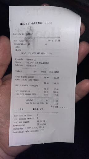 Read moreParking around is difficult luckily they offer valet parking for R$ 20.00. I recommend you have reservations and be punctual they only hold your table for 10 minutes ( I love the concept) The inside looks like an authentic Irish pub very laid back and chill. Inside you can enjoy live music mostly English songs a R$ 20.00 cover charge per person is required. Food prices are reasonable, I DO NOT recommend 1. the chicken nachos 🧀 2. Fish and chips are more like fish sticks with wedge potatoes. Not your typical British fish and chips 3. Mandioca was hard and unseasoned lastly, their caipiroska de siriguela was mostly ice with very little fruit. I Do recommend you try File cheddar, Bolinha De carne defumada, Fralda red and Spaten beer. Hoots is unique and one of a kind bringing a new concept to town. If this review was helpful, please give it...