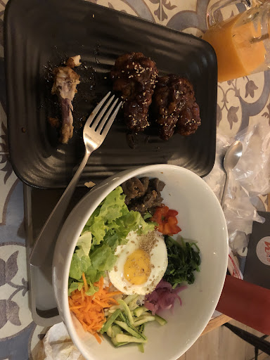 I started out with fresh juice (orange & carrots) and kimchi. I enjoyed both, the kimchi had a nice spice to it. If you like kimchi you need to try theirs it’s so good! I ordered as well a bimbimbap (traditional) and the Korean fried chicken, they were drumsticks with a nice coating on them. I got the spicy version. Both were very delicious, I highly recommend both. If you love fried chicken it is a must try. I highly recommend this place if your looking to try...