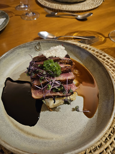 Read moreExperiência gastronômica nível 5 estrelas. Entretanto, minha nota geral ficaria em 4,9, pelo simples fato de as entradas no menu degustação serem muito escassas, embora seja possível entender a proposta, sendo uma opção vegetariana, tradicional (contém tartar de carne de sol muito delicioso) e uma opção vegana. No mais, uma experiência gastronômica que não havia experimentado ainda na cidade. Já fui a alguns restaurantes de alta gastronomia aqui e normalmente aos sabores nós remetem ao "mais do mesmo". Nesse restaurante tive a oportunidade de ter uma experiência de sabores única e que pretendo repetir. De entrada pedimos CROCANTE MANDIOCA COM TARTAR DE CARNE CURADO (CROCANTE DE MANDIOCA, TARTAR DE CARNE BOVINA E PICLES DE CEBOLA, e um purê de banana da terra que não está descrito no cardápio), de prato principal fomos de PATO COM COUVE FLOR E CAJU (PEITO DE PATO GRELHADO, PURÊ DE COUVE FLOR E REDUÇÃO DE CAJÚ), ponto perfeito da carne e o purê estava saboroso demais, algo que me surpreendeu muito e me vez viajar nos sabores, e também pedimos o RISOTO DE FRUTOS DO MAR (RISOTO DE FRUTOS DO MAR, FAROFA DE COCO QUEIMADO E MOLHO VERDE), um sabor inigualável em um risoto que não havia sentido antes, vários sabores e os frutos do mar nos pontos mais que perfeitos. Sobremesa pedimos BANANA COM LICOR BAILEYS BOLO DE BANANA (BRIGADEIRO DE BAILEYS E CHOCOLATE 70% CACAU) e uma TORTA SNICKERS (TORTA DE CHOCOLATE COM CAJÚ E CARAMELO), sendo está última em formato de picolé. Ambas deliciosas mas com destaque para o equilíbrio e sabor suave. Recomendo demais a ida e a...