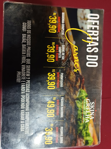 Read moreSempre que dá vou com a minha família, o atendimento é excelente, fez rápido o nosso pedido, os preços são realmente acessíveis, são justos, as porções do que pedidos são bem servidos. Tomamos uma cerveja gelada e no dia que fomos estava pouco movimento, da maneira que gosto, quem não gosta é o proprietário :) ... O Skina Grelha está ocupando o local do antigo Carde de Russas... Recomendo, a comida é boa e...