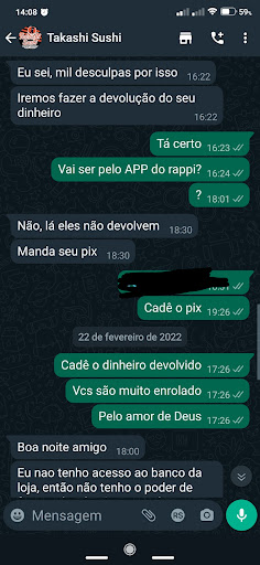 Read moreSob o nome de "Sushi no preço" no Uber Eats, espero nunca mais ter o desprazer de ver este restaurante na minha vida. Pedido realizado por volta de 20h, com previsão de entrega até 21:05. Mas conforme imagem, às 22:39 nada de ter sido entregue. E você liga e eles dizem que está com o motoqueiro em rota. Você pede para cancelar e eles dizem que não podem fazer nada. E ai não sei se o motoqueiro ou o restaurante é desonesto a ponto de fechar o pedido como entregue às 23: 43. Quase meia-noite!!! Mas nada que não tenha ética e dignidade se sustenta, ainda mais em tempos de pandemia. Espero que esse estabelecimento sequer apareceça mais como opção...