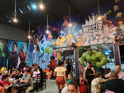 Read moreQue lugar legal!!! Muito lúdico, batata frita sequinha, hambúrgueres deliciosos e temáticos. Ambiente muito animado, espaçoso, com brinquedos (bonecos e bonecas, luvas de personagens) nas mesas, decoração de personagens Disney, Marvel, DC. E além do ambiente temático, os personagens são um show à parte, circulam pelo ambiente e vão às mesas, são bastante simpáticos com as crianças e pacientes para a quantidade de fotos solicitadas. Se você tem uma criança com sensibilidade a barulho e luzes, é melhor evitar. Possui trocador no banheiro, o que é bem legal, mas senti falta de um banheiro infantil, já que a quantidade de crianças é grande. Eles não tem estacionamento, procurem vagas nas ruas laterais. Cobram couvert e aceitam reserva de mesas. Fomos num dia de sábado e haviam muitas mesas reservadas para comemoração de aniversário, muitas pessoas levando bolo e lembrancinhas. O preço é compatível com o estilo de lugar. Muitos detalhes fofos, como as batatinhas no carrinho e a tábua do hambúrguer no formato de Mickey. Nós simplesmente adoramos! Vale demais a experiência. Dica: cheguem cedo porque o ambiente fica lotado ao ponto de formar fila na entrada, ou...