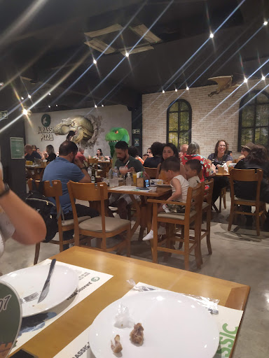 A casa é bem decorada, tem um dinossauro mega simpático interagindo com todos e funcionários prestativos também. Mas, se você curte conversar enquanto come, não vá. Se você não gosta de crianças, não vá. Se você gosta de crianças, também não vá. Te explico: o ambiente é menor do que parece, com mesas bem apertadinhas. Banheiros sem papel higiênico ou para as mãos. Criançada pra todo lado gritando. Aniversários e parabéns aos montes (o que é legal, até). Mas a comida é desastrosa. Todas as pizzas tem a mesma base... Molho e um tipo de muçarela. Daí para variar são acrescidos um ou outro pepperoni, uma ou outra calabresa, um tantinho de carne desfiada... Há sabores bem intencionados, mas quem sai de casa para comer pizza de alho, de brócoli com queijo, abobrinhas com queijo, rúcula com queijo?... As porções são infantis. Massa fininha e mini pedacinho (ideal para criancinhas). As pizzas doces tbm tem a mesma base: um chocolate derretido em que é acrescido amendoim ou côco ou confeitos etc. Na prática, tudo igual. Há fritas e frango a passarinho. Dependendo do local da mesa, é só isso que vai comer, pois só chegam pizzas de vegetais e alho. O grand finale... O preço: 230 reais para três pessoas sem contar o serviço. Cada um tomou um refrigerante. A proposta é jurássica, então se prepare para ter seu $$$ e sua...
