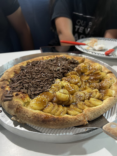 A pizza é deliciosa, os tamanhos são bem generosos (até mesmo a brotinho), massa fininha, recheio com ingredientes de qualidade. Na ocasião estávamos em 4 pessoas e pedimos uma gigante, sabores 4queijos(queijos de qualidade), portuguesa, palmito e calabresa. Todas acompanharam azeitona sem caroço. E pra finalizar uma brotinho nos sabores chocolate e Romeu e Julieta. Chocolate bom e goiabada deliciosa. Com certeza...