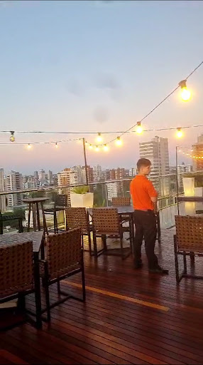 El hotel ofrece éste resto bar en terraza al aire libre con vistas a la ciudad increíbles a cualquier hora del día! El espacio es muy reducido, con capacidad para pocas personas. No cobran ingreso a los clientes del hotel. Al parecer si a personas que no. El menú de comidas y bebidas no es muy variado pero a buenos precios. Cuentan con mesas y sillas bajas y altas. Los mozos muy amables. Lo único malo es que si llueve cierran. También hay otro resto bar en el ante piso a la terraza todo cerrado con AA. El lugar es chico pero súper cómodo con Mesas y sillas bajas y altas también. La piscina infinita es pequeña ubicada en la terraza. No cuentan con bañeros y es profundo ( 1.50mt) Tener cuidado con niños. Pasan música copada pero por momentos muy fuerte. El ambiente es muy agradable para ir en flia, con pareja o amigos. Poco seguro para niños chicos. No cuentan con accesos para personas con dificultades de movilidad o discapacidades físicas. Únicamente una escalera pequeña. En gral., es un lugar espectacular por las vistas a la ciudad pero con algunas...