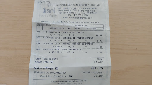 Read moreSempre ouvi falar muito bem da Iraci, já havia comido uma torta deliciosa no local, mas decidi fazer uma encomenda para festa da minha filha e me decepcionei. Pedi o bolo rosa, veio branco, os salgados frios e murchos, os docinhos razoáveis. Pedi tortinha de limão, não veio nenhuma embalagem ao redor para poder servir, pedi um docinho espelhado, veio muito duro, não conseguia morder. Sem dizer que diante da circunstância do erro na cor do bolo, simplesmente pediram desculpa, não apresentaram nenhuma empatia, com a...